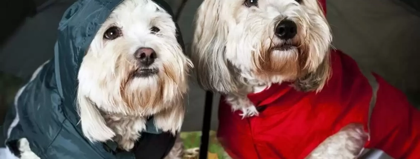 These great raincoats contain built in hoods that act as an umbrella for your pooch in the rain. You may get some strange looks but your pet will stay dry-as-a-bone! There are also umbrellas you can purchase that allow you to hold the handle by your side, as the umbrella is opened over your pet. Very clever, but some of you may just want to wait until the weather passes before venturing out.
